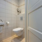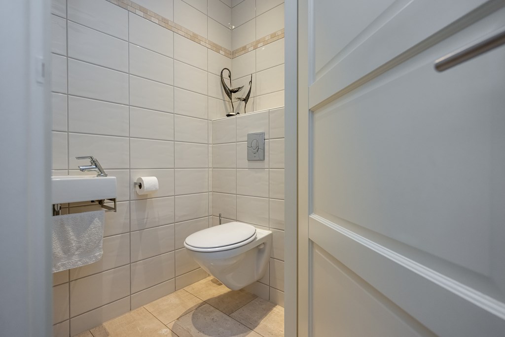 Marmerenvloer voorzien van vloerverwarming, zwevend toilet, fontein, mechanische afzuiging en geheel betegeld.