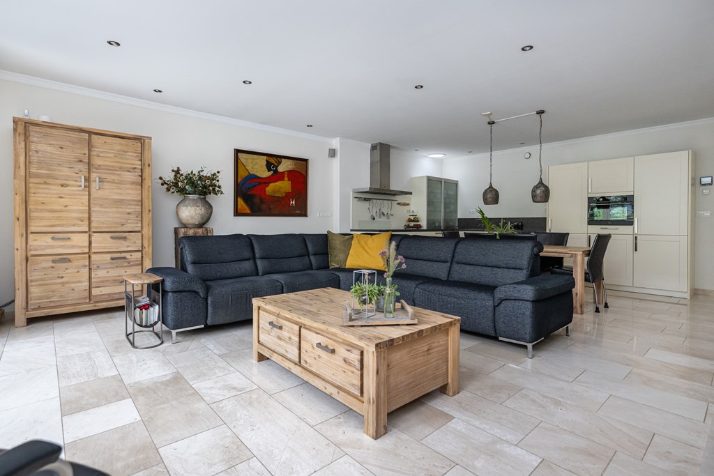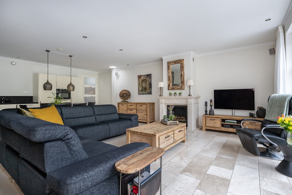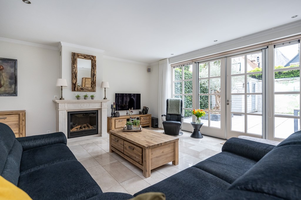 Marmerenvloer voorzien van vloerverwarming, gashaard, openslaande deuren naar tuin, rolhor en spots in plafond.