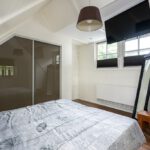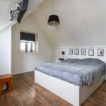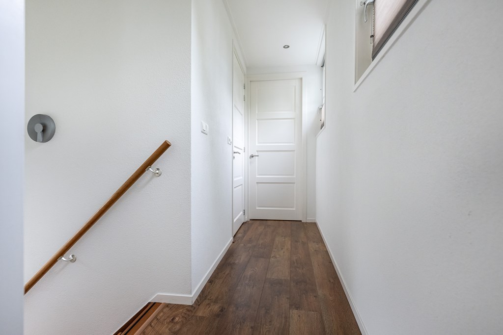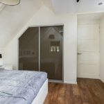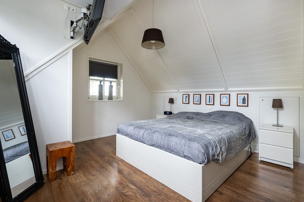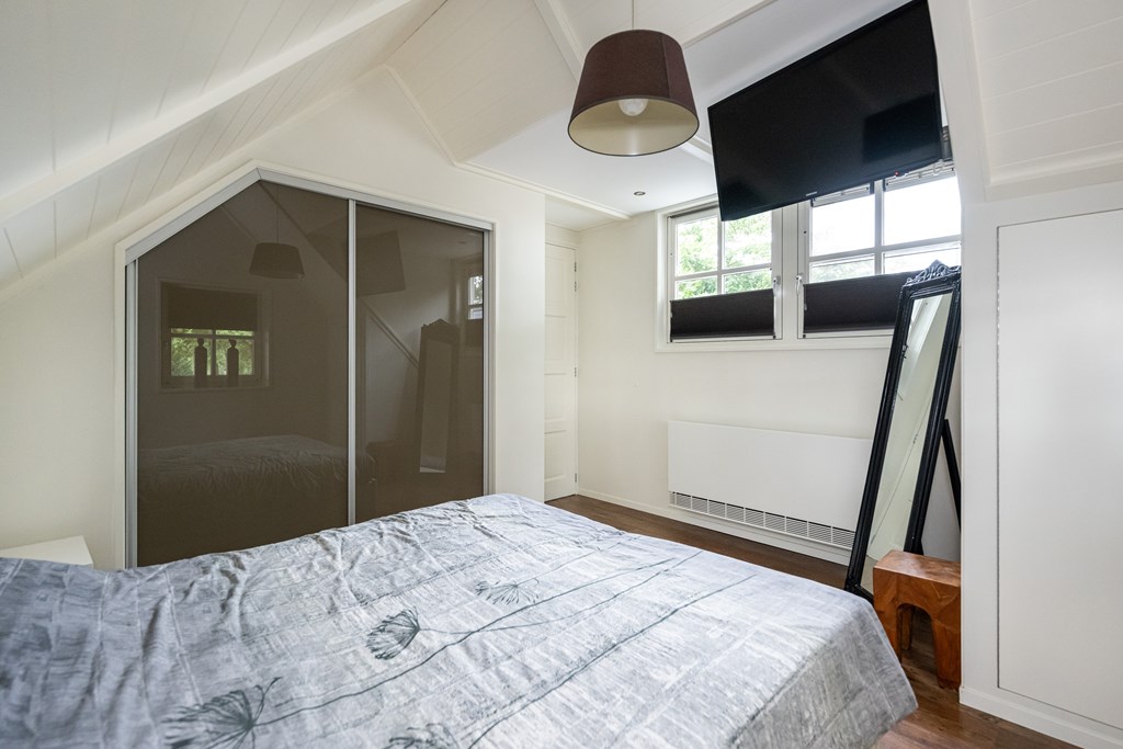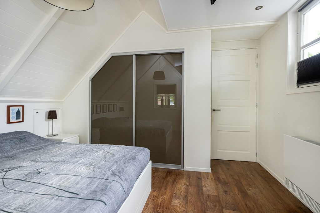 Laminaatvloer, radiator met elektrische verwarmings- en koelstand, geïntegreerd in het warmtepompsysteem, draai/kiepraam, vaste bergkast, schuifkast en bergruimte achter knieschot.