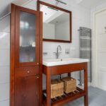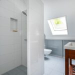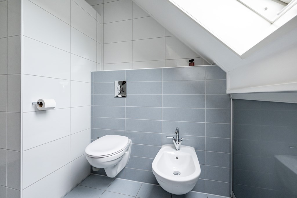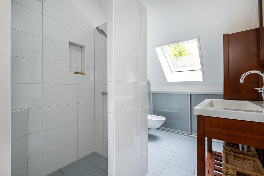 Velux dakraam met elektrische bediening en automatisch rolluik, geheel betegeld, plavuizenvloer, zwevend toilet, bidet, handdoeken radiator, wastafel met meubel, inloopdouche, mechanische afzuiging, spots in plafond en een schuifkast.