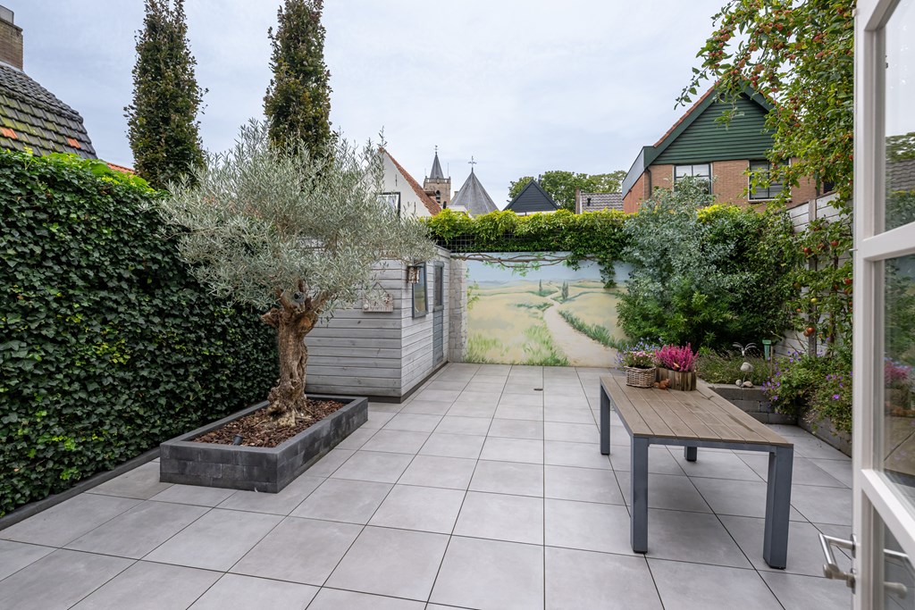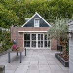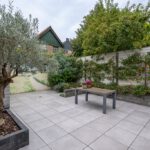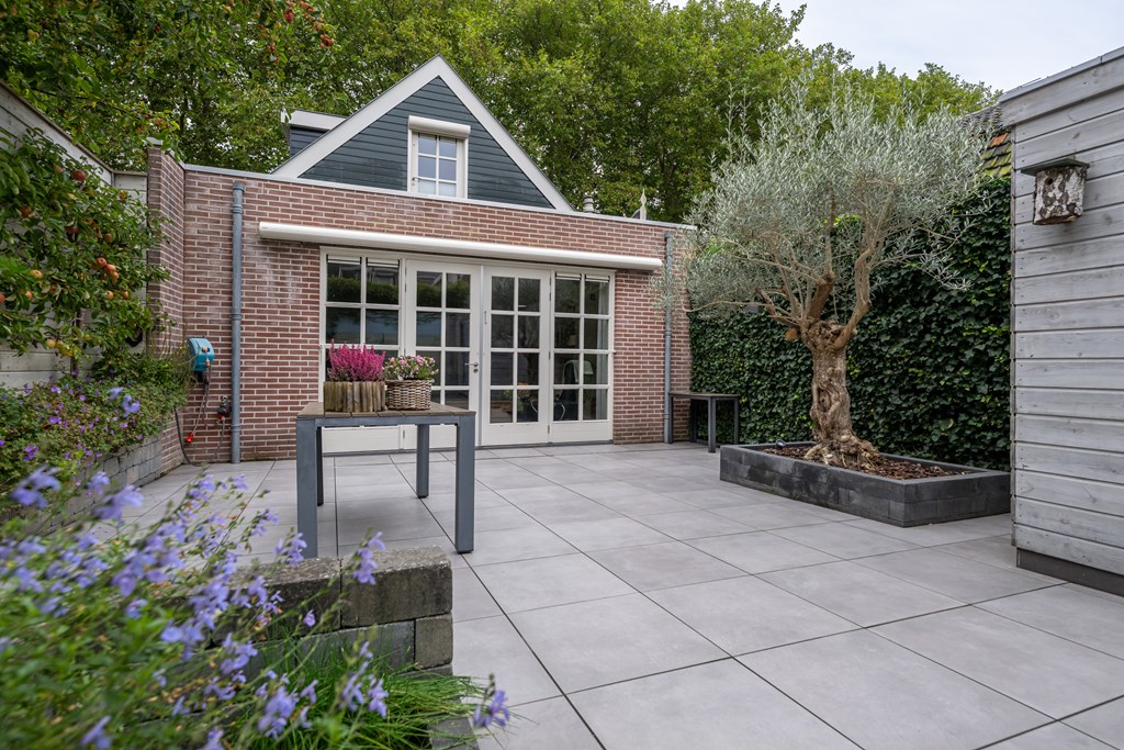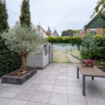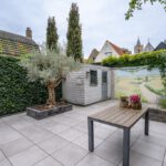 Terrastegels, drain, borders, zonnescherm, fruitbomen en een buitenkraan.