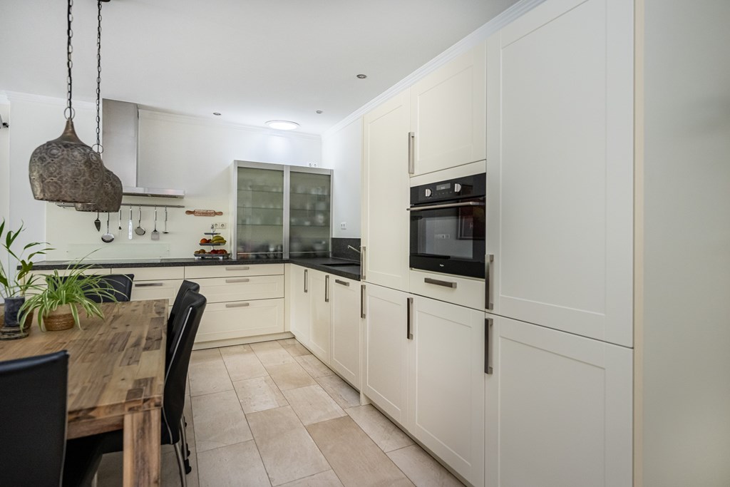 Marmerenvloer voorzien van vloerverwarming, inductiekookplaat met 8 kookzones, afzuigkap, aanrechtblad van geborsteld graniet, enkele spoelbak, vaatwasser, koelkast, vriezer, combi-oven en een daglichtsysteem.
