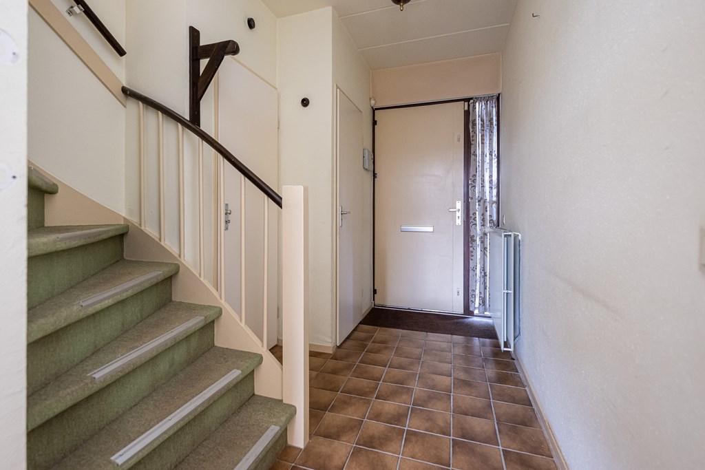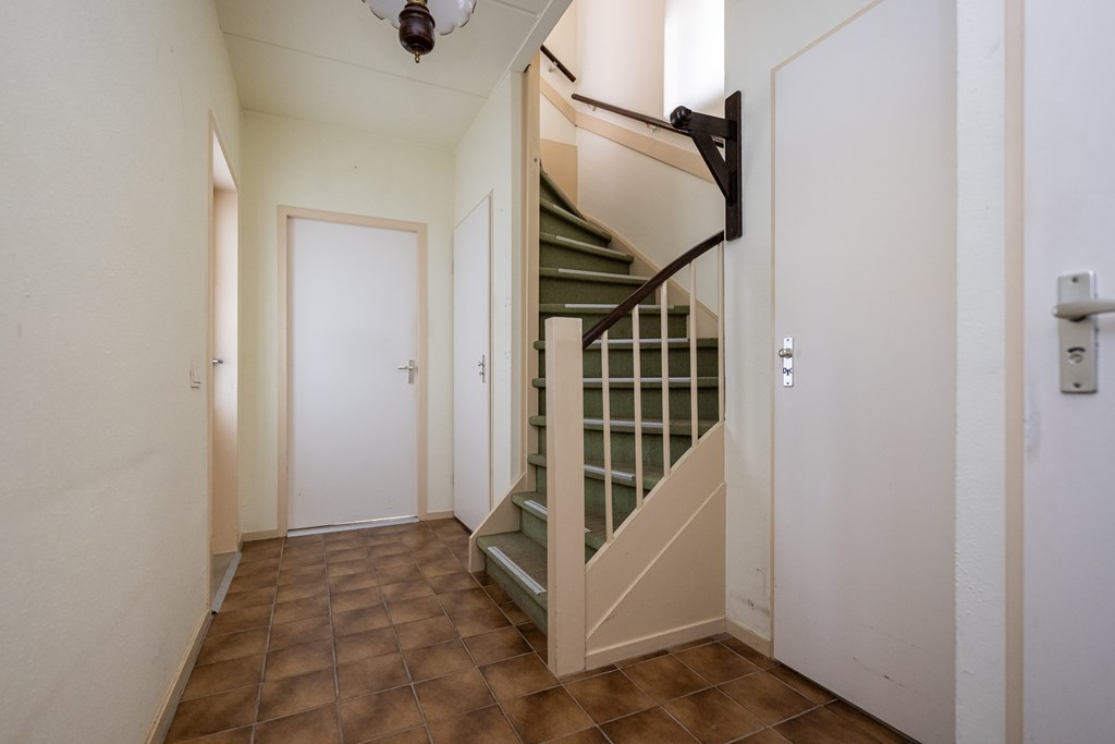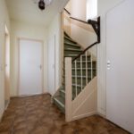 Plavuizen vloer, meterkast, radiator, trapkast en trapopgang.