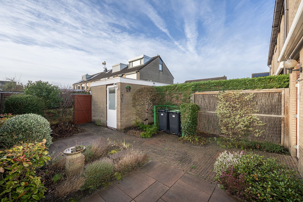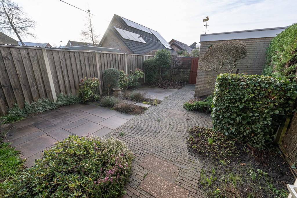 Op het zuiden, betegeld/bestraat, diverse beplanting, eigen achterom en stenen berging v.v. elektra.