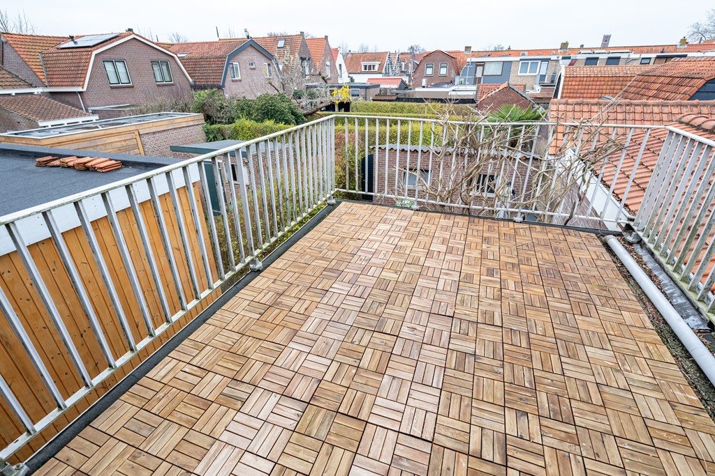 Extra fijn is dat u niet alleen beneden, maar ook boven volop kunt genieten van de zon. Het dakterras op het zuidwesten is een heerlijke plek om na uw werk nog even buiten te zitten, met een kop koffie in de ochtendzon of juist aan het einde van de dag wanneer de zon laag staat.