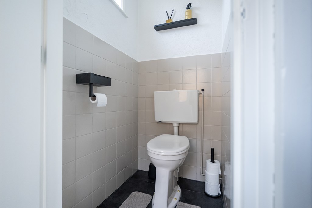 Staand, laminaatvloer en half betegeld.