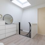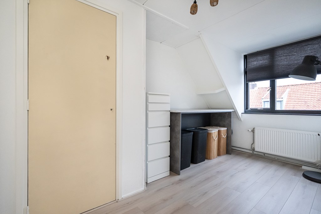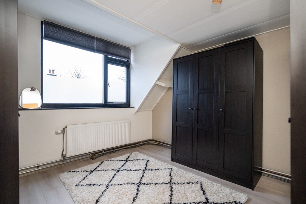 Laminaatvloer, radiator, vaste kast en dakkapel.