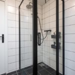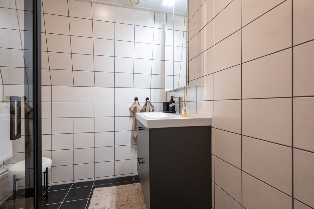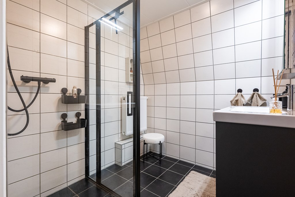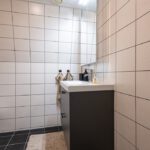 Plavuizenvloer, douchecabine, wastafel met meubel, radiator en geheel betegeld.