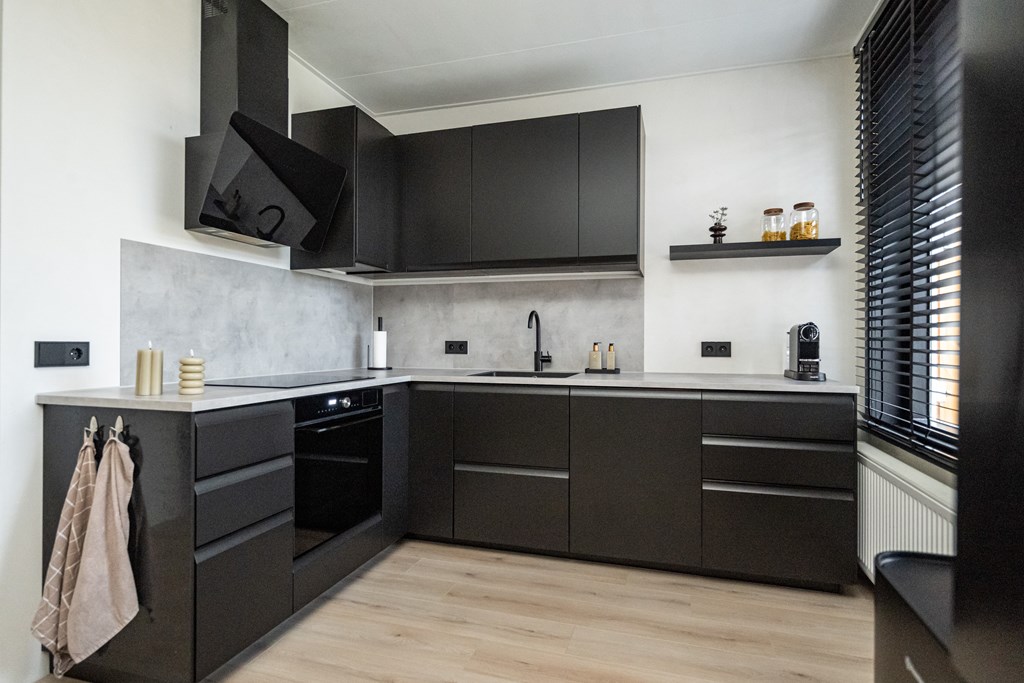 Laminaatvloer, 4-pits inductiekookplaat, elektrische oven, afzuigkap, vaatwasser, enkele spoelbak en een losse koel/vries combinatie (ter overname).