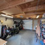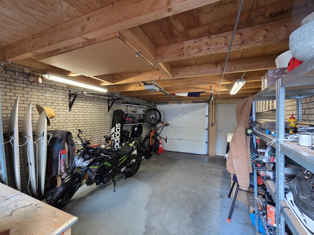 Elektrische garagedeur, betonvloer, zolder verdieping en elektra.