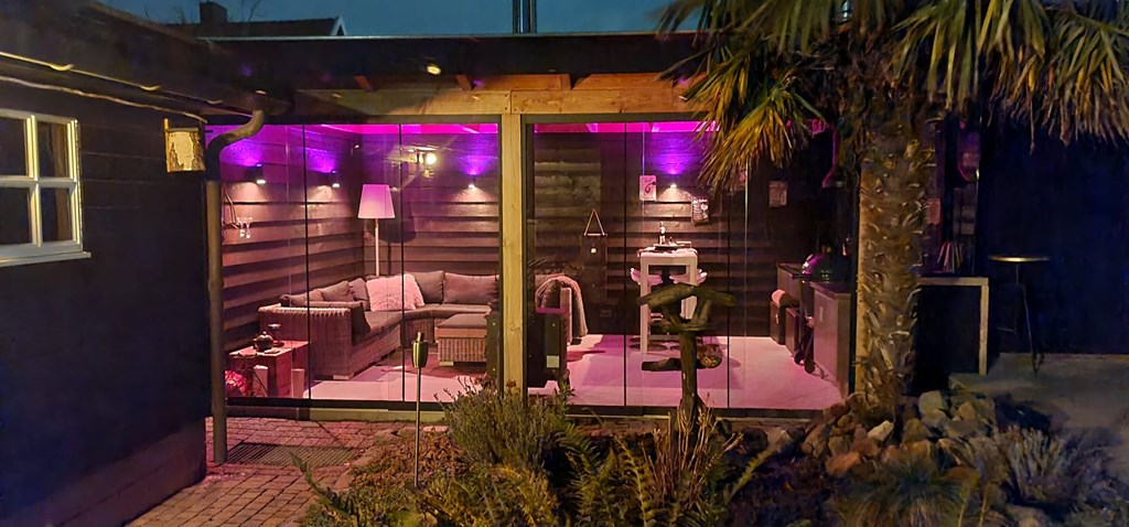 Toegang vanuit woonkamer d.m.v. schuifpui, eigen ingang, plavuizenvloer, terrasheater, houtkachel, verlichting en elektra.