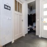 Plavuizen vloer, trapopgang en garderobe met radiator.