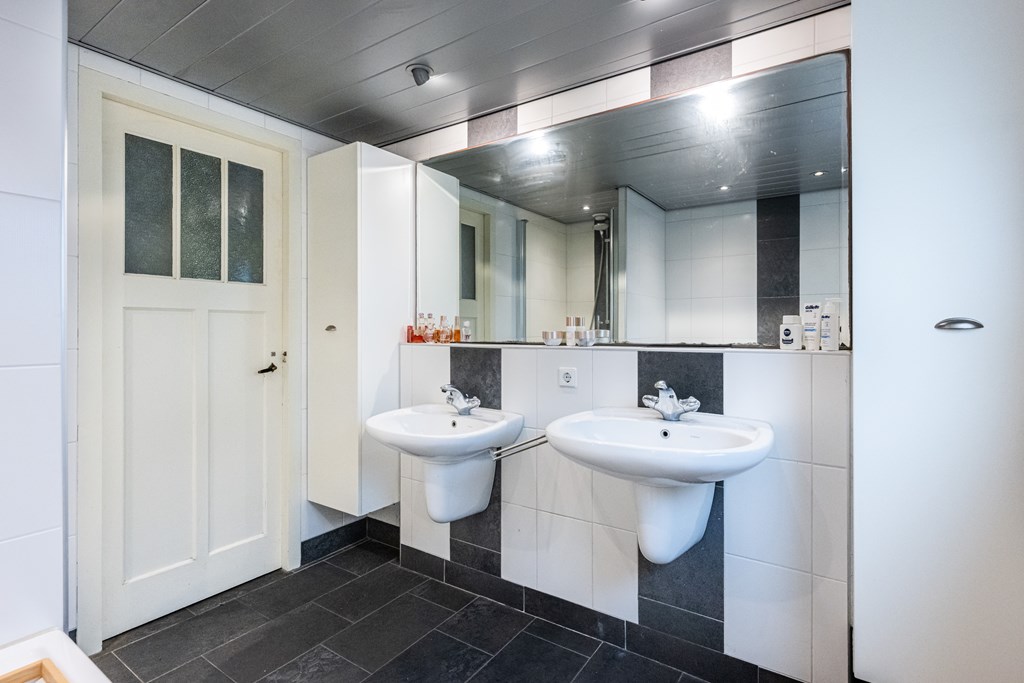 Plavuizen vloer v.v. vloerverwarming, douchecabine, ligbad, dubbel wastafel, spots in plafond, mechanische afzuiging en geheel betegeld.