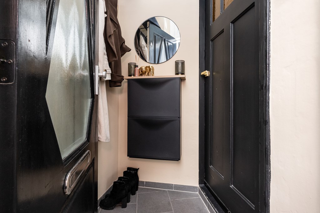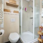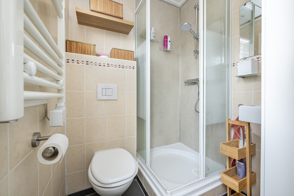 Plavuizenvloer, douchecabine, elektrische afzuiging, zwevend toilet, wastafel, elektrische handdoekenradiator, spots in plafond, witgoedaansluitingen, warm water boiler (80 liter) en toegang tot achterplaats.