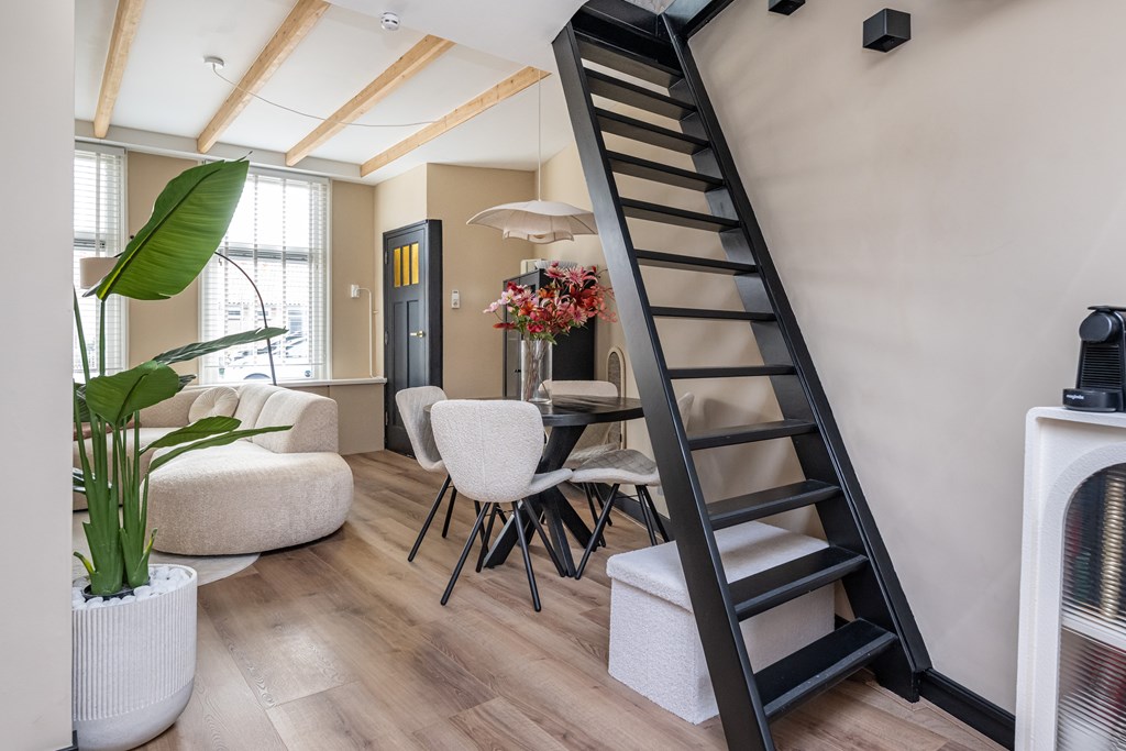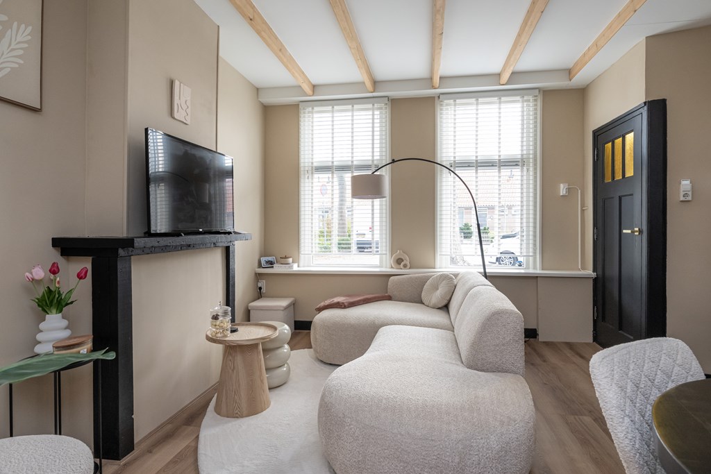 De woonkamer biedt een prettige lichtinval, mede dankzij de nieuwe HR++-ramen aan de voorzijde en het feit dat de gehele woning voorzien is van dubbel glas. Bovendien is de eerste etage uitgerust met HR++-glas. Hierdoor profiteert u niet alleen van extra comfort, maar ook van een lagere energierekening. Het energiebewuste karakter van de woning wordt verder versterkt door de aanwezigheid van vier zonnepanelen, die bijdragen aan een duurzamer en voordeliger energieverbruik.