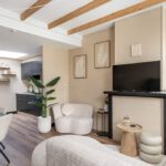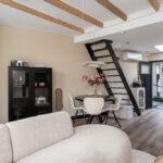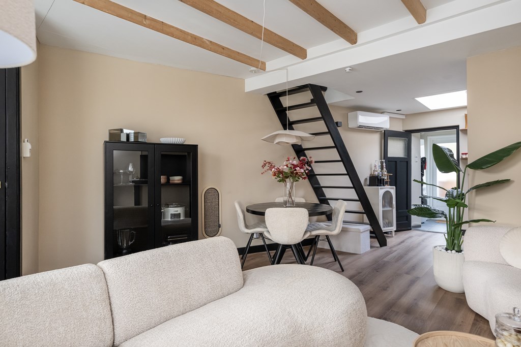 Laminaatvloer, schouw, airconditioning en balkenplafond.