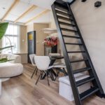 Laminaatvloer, enkele spoelbak, 4-pits inductiekookplaat, afzuigkap, combi-oven, koelkast met vriesvak en trapopgang.