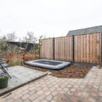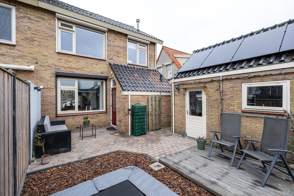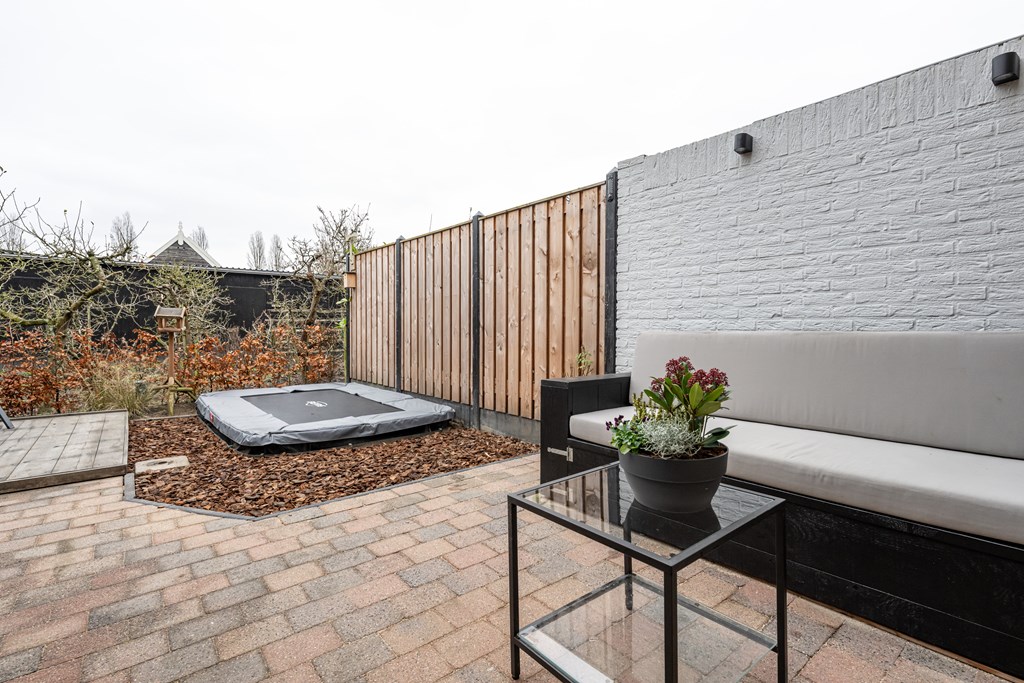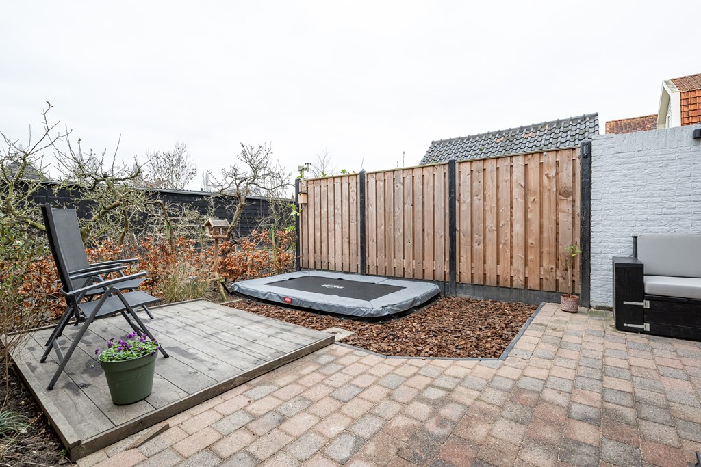 Deels bestraat, vlonder terras, trampoline (ter overname), buitenkraan en een achterom.