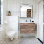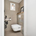 Plavuizenvloer met elektrische vloerverwarming, zwevend toilet, fontein en geheel betegeld.