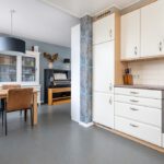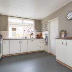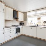 Marmoleumvloer met vloerverwarming, 4-pits gaskookplaat, elektrische oven, afzuigkap, vaatwasser, enkele spoelbak, koelkast en spots in plafond.