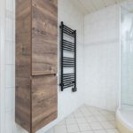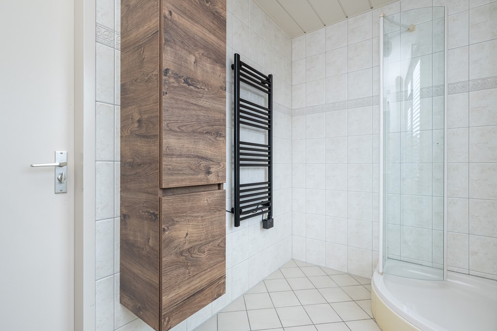 Plavuizenvloer, zwevend toilet, douchecabine, wastafel met meubel, handdoekenkast, radiator, elektrische radiator (ter overname), elektrische afzuiging en geheel betegeld.